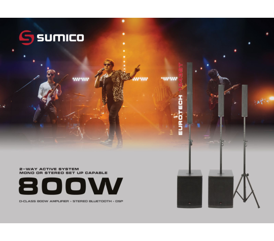 - Sumico EUROTECH 1243ST là loa Column Array Active di động 2 đường tiếng công suất 800W RMS có Subwoofer 12 inch (304mm) và 8 loa Fullrange 3 inch (76mm), điều khiển bằng DSP, là giải pháp âm thanh thanh lịch cho các sân khấu nhỏ và vừa. Thanh cột Line Array của EUROTECH 1243ST có thể nhập chung hoặc tách thành 2 thành phần tùy theo nhu cầu dùng cấu hình Mono hoặc Stereo. Loa có công nghệ kết nối Bluetooth 5.3 thời thượng, tính năng kết nối Stereo Bluetooth 2 loa EUROTECH 1243ST thiết lập hệ thống âm thanh Stereo không dây (True Wireless Stereo). nhiều chế độ DSP tùy chỉnh như: 3 chế độ EQ âm thanh thiết lập sẵn cho Music, Live, Speech, tùy chỉnh EQ 3 dải âm Low, Mid, High và Cắt tần số HPF (High-Pass Filter). Với thiết kế gọn nhẹ dễ dàng tháo lắp cho di chuyển lưu động, Sumico EUROTECH 2825 là lựa chọn lý tưởng cho quán café, bar club, sân khấu hát live và acoustic nhỏ, hội trường đa năng, khu giải trí, nhà thi đấu, sự kiện biểu diễn lưu động nhỏ hoặc phòng Karaoke cao cấp.